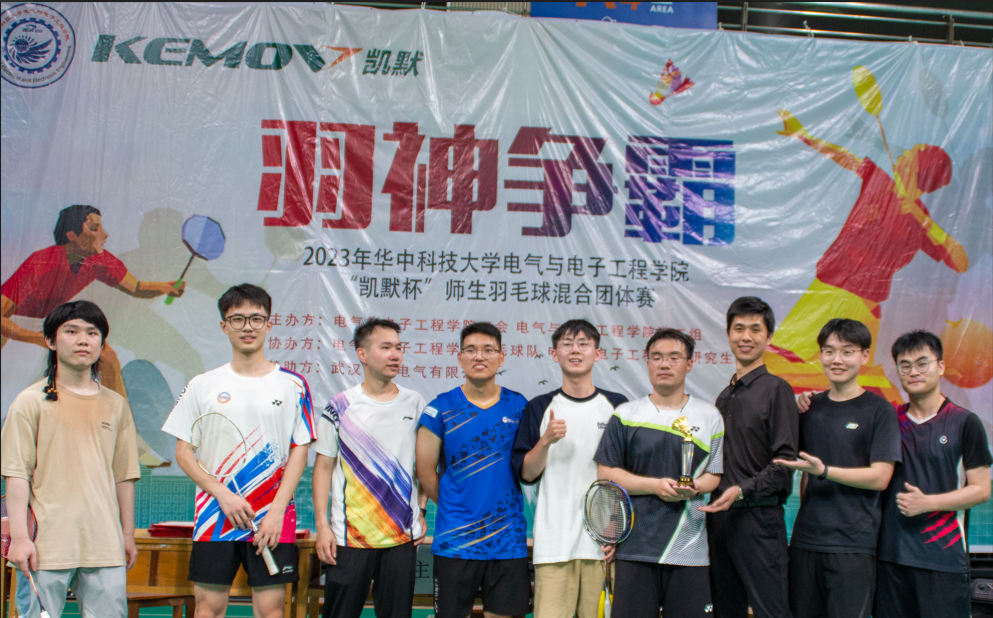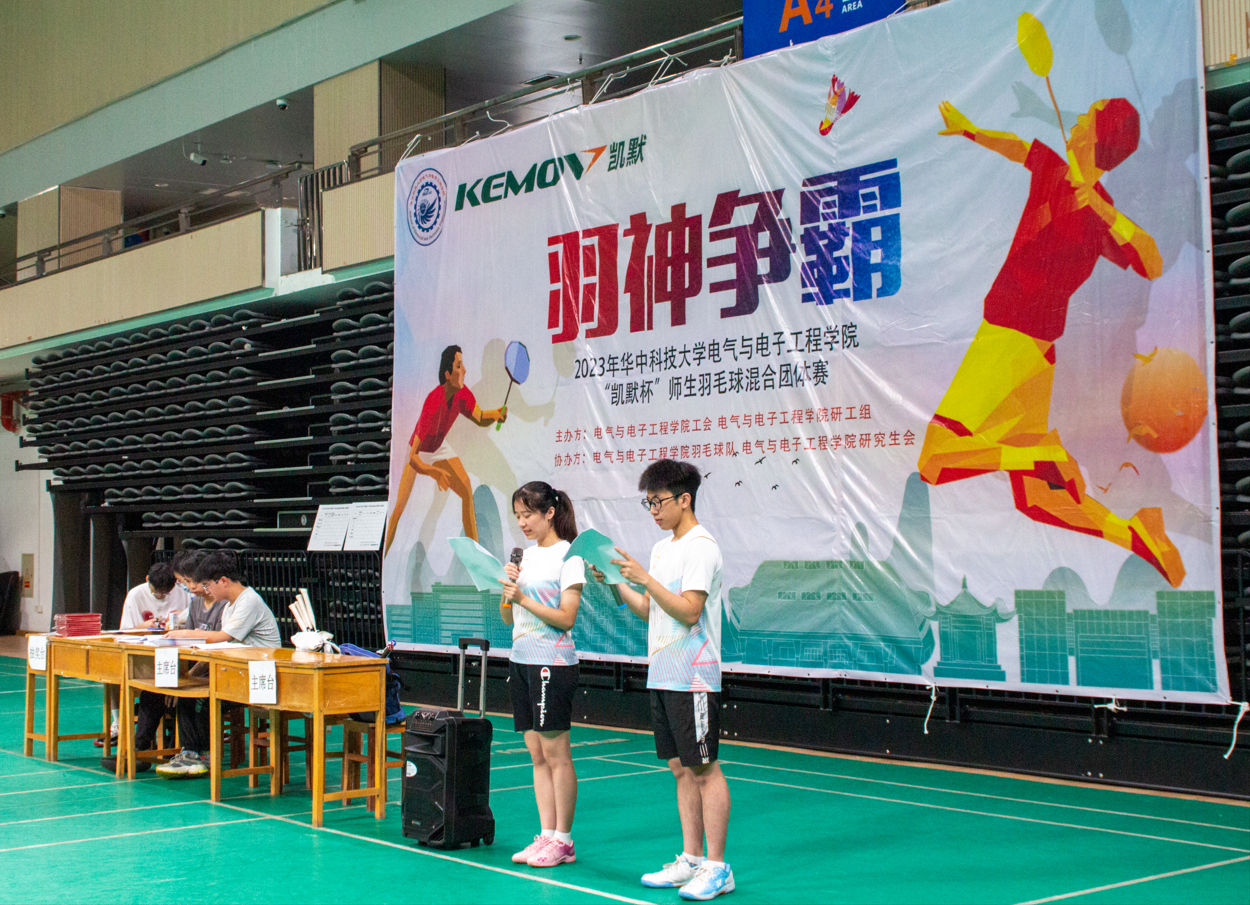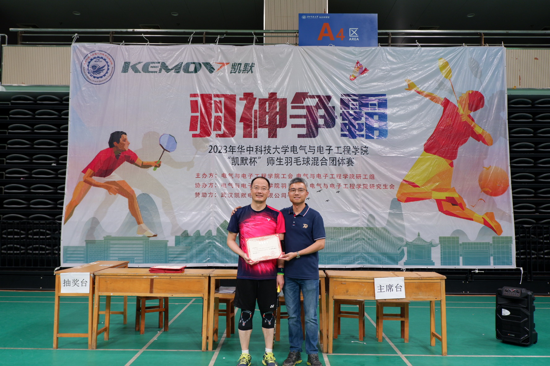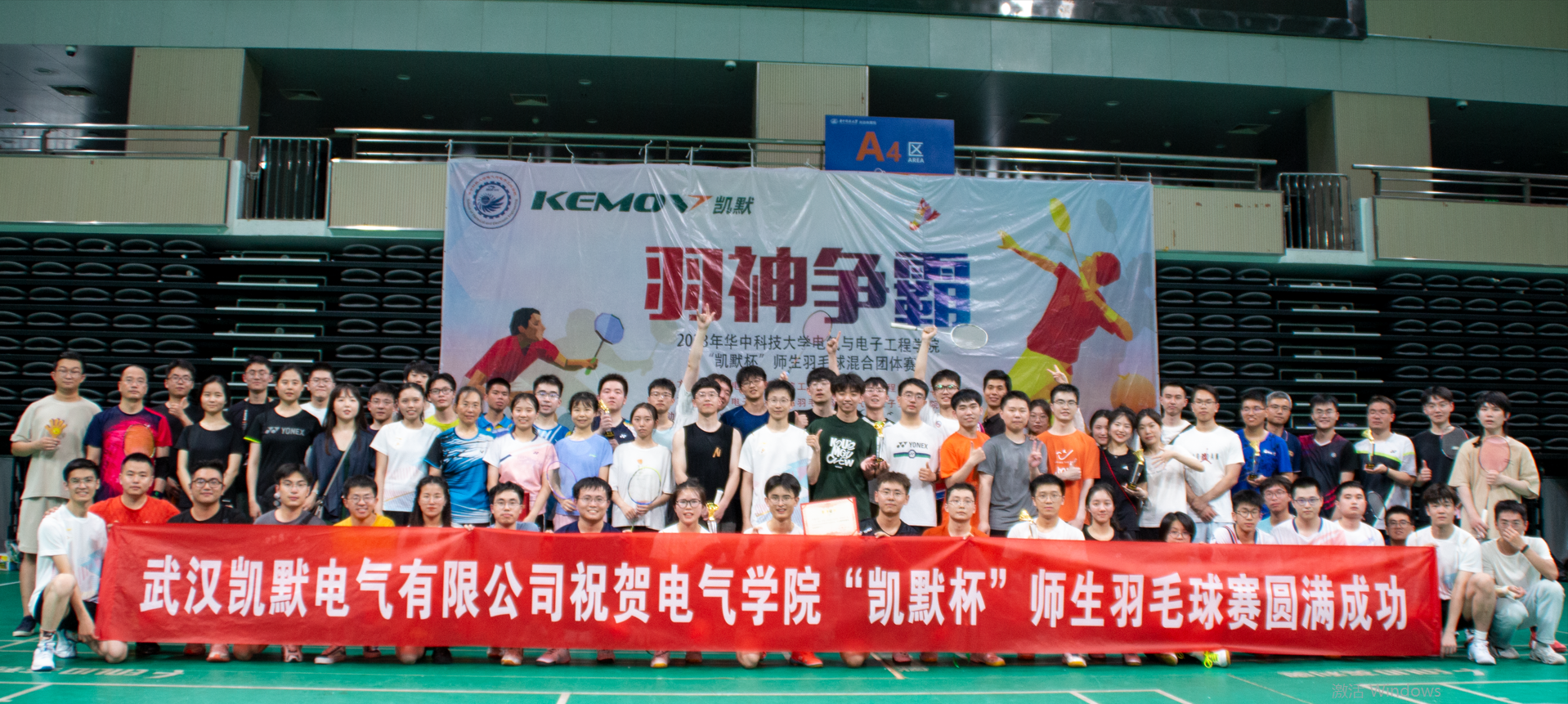 2023年6月10日,由華中科技大學電氣與電子工程學院工會和電氣與電子工程學院研工組聯合主辦,電氣學院研究生會和電氣學院羽毛球隊共同協辦,武漢凱默電氣有限公司贊助的2023年電氣學院“凱默杯”師生羽毛球賽在華中科技大學光谷體育館成功舉行。華科電氣工會主席陳立學老師出席開閉幕式并致辭。凱默電氣董事長楊經超、工會主席姚進波、總經辦員工作為贊助商觀看了本次比賽,并參與了頒獎儀式。