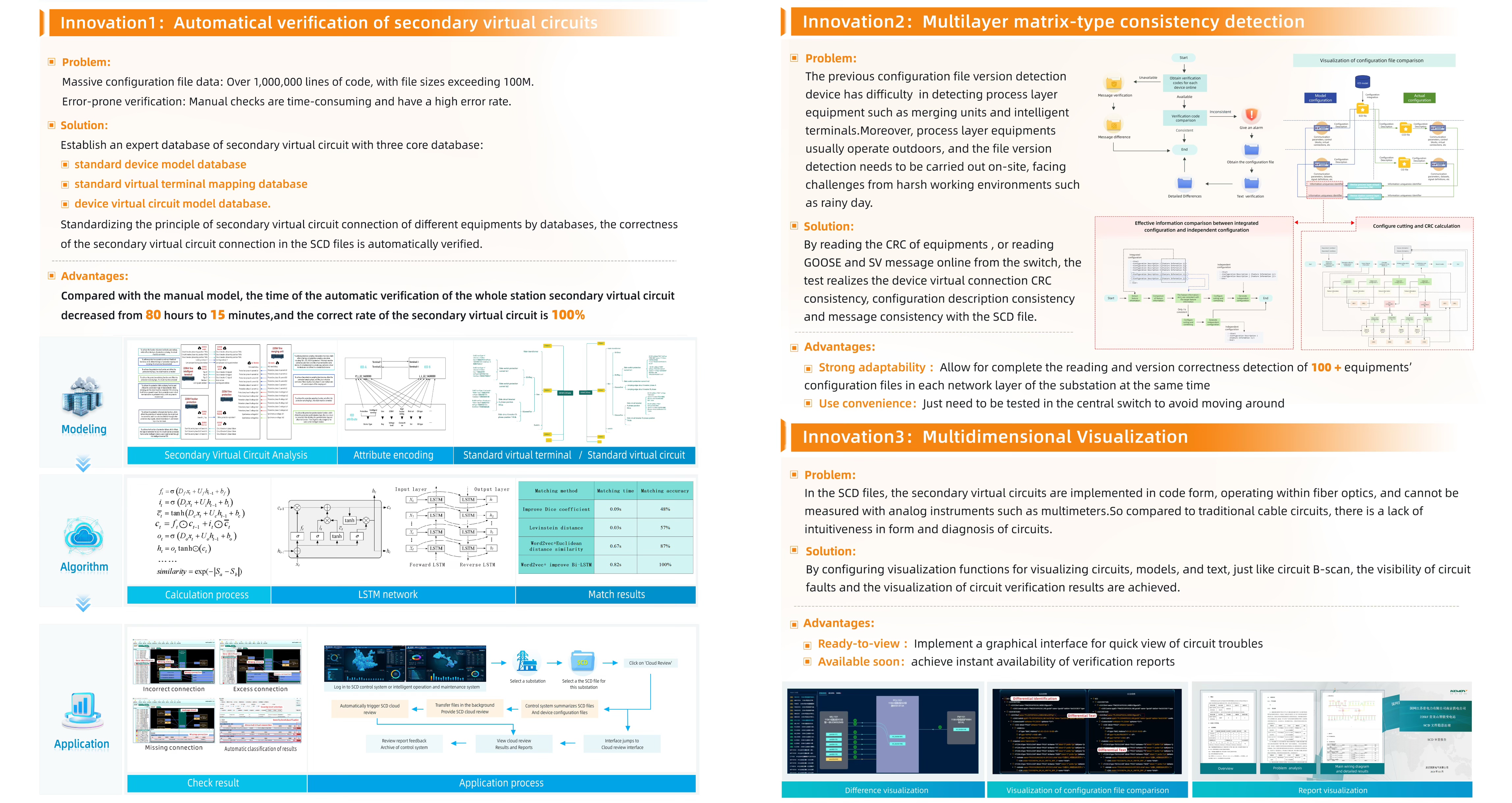 此次獲獎(jiǎng)的“智能變電站二次虛回路自動(dòng)校核裝置”,面向智能變電站二次虛回路的檢測(cè)工作復(fù)雜繁瑣且容易受到人為因素影響的問(wèn)題,以及大量智能變電站因配置隱患問(wèn)題“帶病運(yùn)行”的技術(shù)現(xiàn)狀,通過(guò)標(biāo)準(zhǔn)庫(kù)文件構(gòu)建+IED信息自動(dòng)提取+配置文件CRC算法等核心技術(shù),實(shí)現(xiàn)對(duì)變電站二次虛回路的自動(dòng)校核,精準(zhǔn)發(fā)現(xiàn)虛回路配置錯(cuò)誤,大大減少了人工干預(yù),提高了工作效率和準(zhǔn)確性。