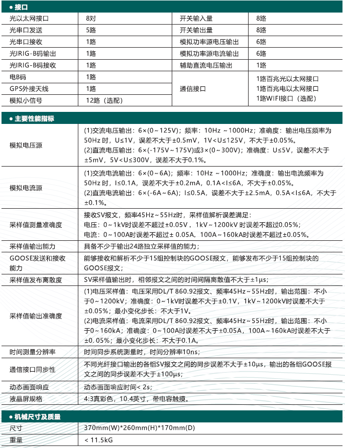 17. 具有至少4路光以太網口和9路FT3光串口接口,可實現多側信號輸出測試,滿足母差和備自投測試的需求;