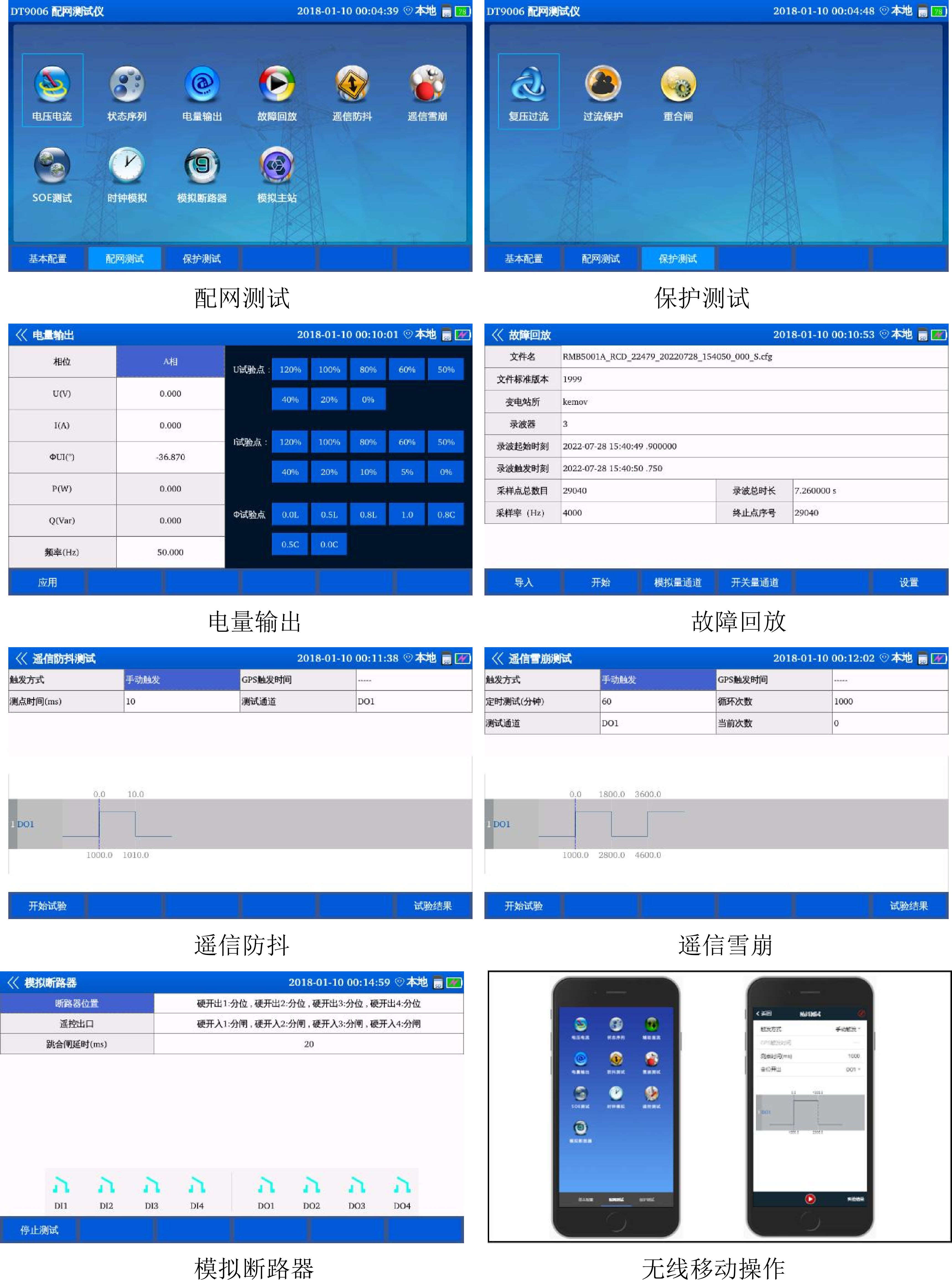 - DT9006配網(wǎng)測(cè)試儀采用異構(gòu)多核心架構(gòu)、觸控式交互、動(dòng)態(tài)功率控制等技術(shù),具備高采樣率的多路電壓、電流輸出和大容量續(xù)航能力。提供備用電池,支持模擬電壓電流功能、狀態(tài)序列測(cè)試、電量輸出、模擬斷路器、模擬主站、遙信防抖、遙信雪崩、遙信分辨率、故障回放和保護(hù)功能測(cè)試等,能夠?qū)︷伨€終端(FTU)、站所終端(DTU)和配變終端(TTU)進(jìn)行測(cè)試和故障檢修。支持無(wú)線連接移動(dòng)終端遠(yuǎn)方控制配網(wǎng)測(cè)試儀,操作人員通過(guò)手機(jī)遠(yuǎn)方控制便可完成配網(wǎng)測(cè)試和保護(hù)功能測(cè)試,針對(duì)塔、桿式設(shè)備的測(cè)試可以避免一定的攀爬作業(yè)。
